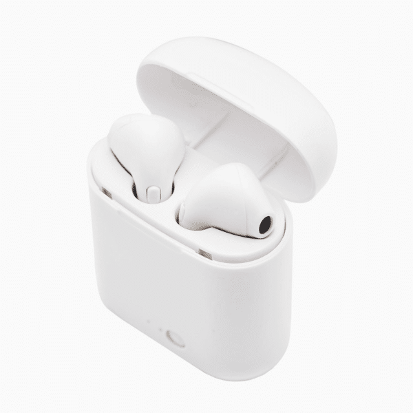 Auriculares inalámbricos con estuche de carga y micrófono incorporado. Posee tecnología bluetooth 5.0; la capacidad del auricular es de 55mAh y su capacidad de carga es de 300mAh. Cuenta con cobertura bluetooth en una distancia de 10 metros y su duración en funcionamiento es de 3 horas seguidas. Mantiene la carga sin uso por 120 horas y el tiempo de carga es de 50 minutos. Funciones touch: un toque para pausar/reproducir música; dos toques para redial. Medidas : 8 x 3,5 cm.