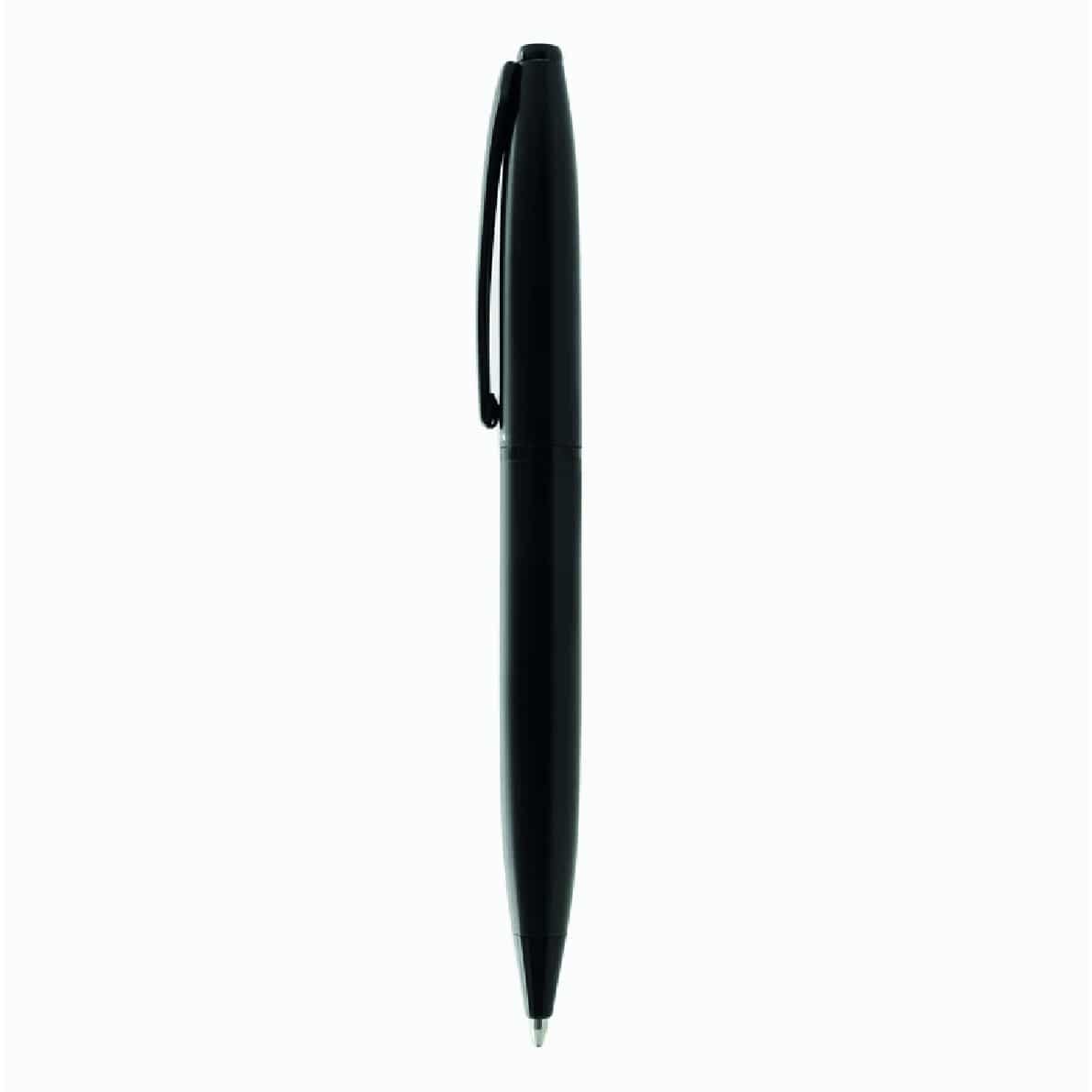 Bolígrafo de cuerpo metálico en acero con detalles en negro mate. Cuenta con tinta azul y apertura con medio giro. Medidas: 13,8 x 1,25 cm. Roupen.