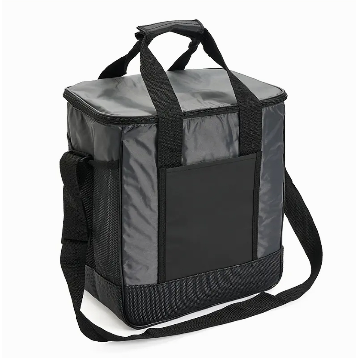 Cooler con doble asa y correa regulable. Está confeccionado en tela 70D, con interior de aluminio y espuma PE. Cuenta con compartimiento principal con cierre, bolsillo frontal y dos asas superiores reforzadas. Es ideal para conservar alimentos y bebidas en salidas o traslados.