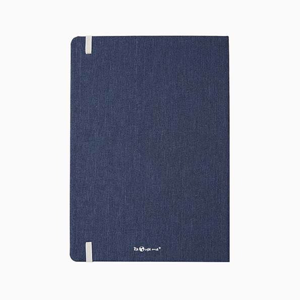 Cuaderno de tapa confeccionado con material RPET, hecho con botellas de plástico reciclado. Cuenta con una cinta marcadora y un cierre elástico.96 hojas lisas de 70g de bordes redondeados. Medidas : 17,6 x 25cm.