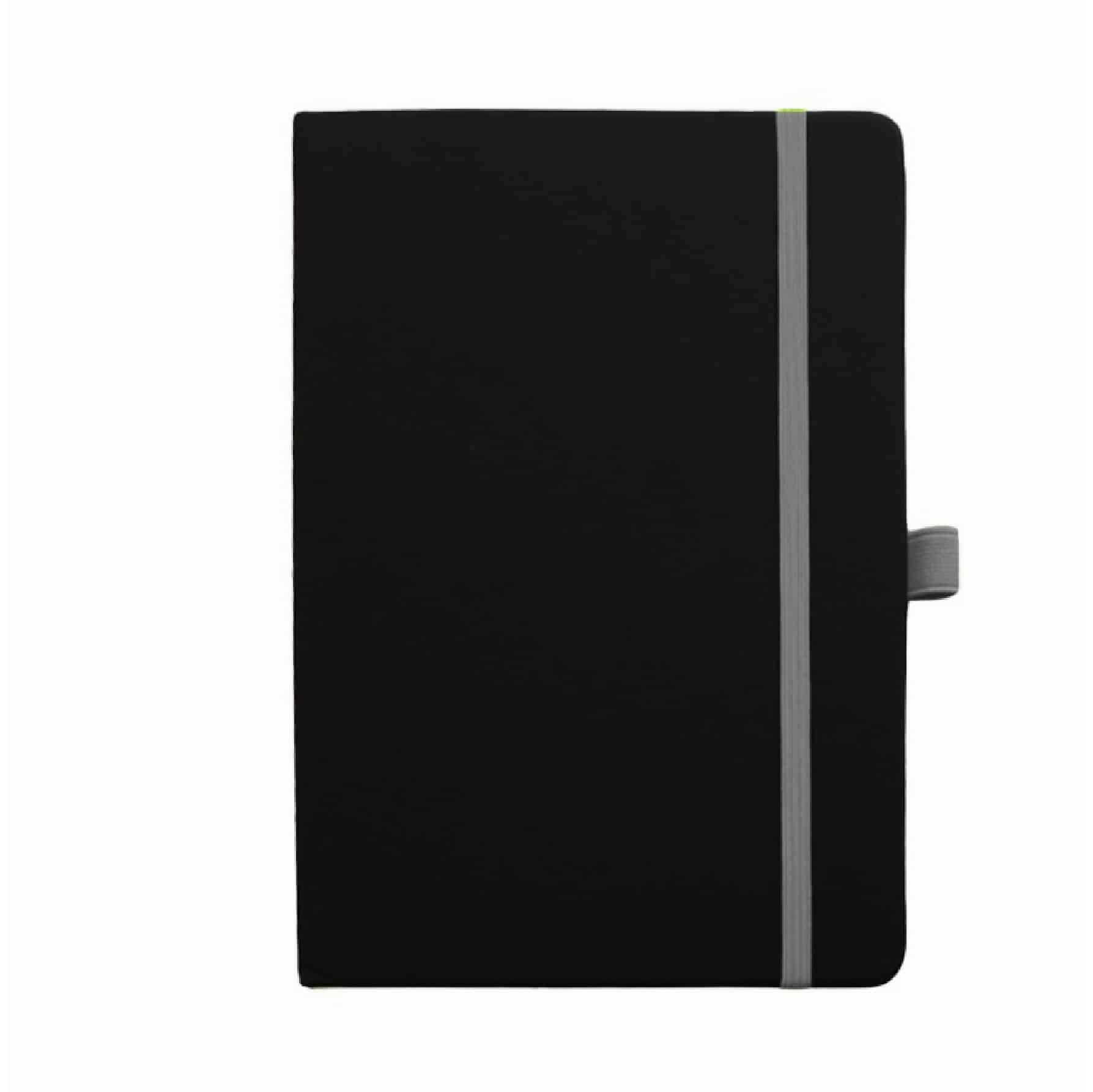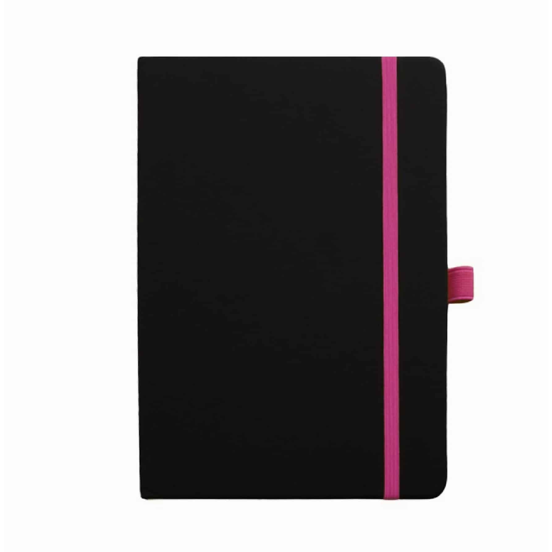 Cuaderno con tapa dura y encuadernado lateral. Tiene 80 hojas blancas rayadas, un soporte para bolígrafo, un separador de tela y un cierre elástico de color. Sus medidas son 14 x 21 cm y está hecho principalmente de PVC.