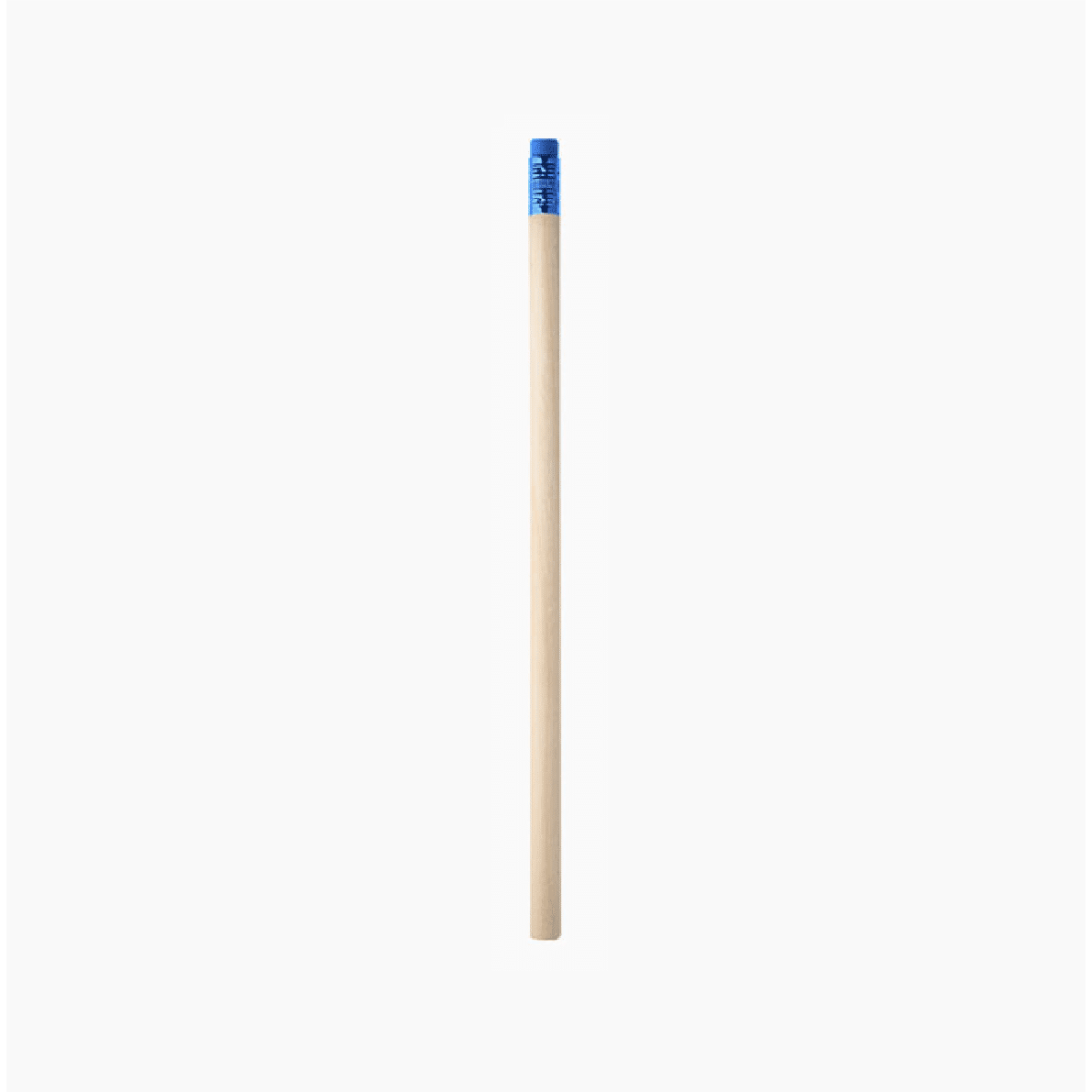 | Lápiz ecológico de madera y grafito. Incluye en la parte superior una goma azul francia recubierta por una férula de metal del mismo color. Tiene una graduación HB y se entrega sin punta. |