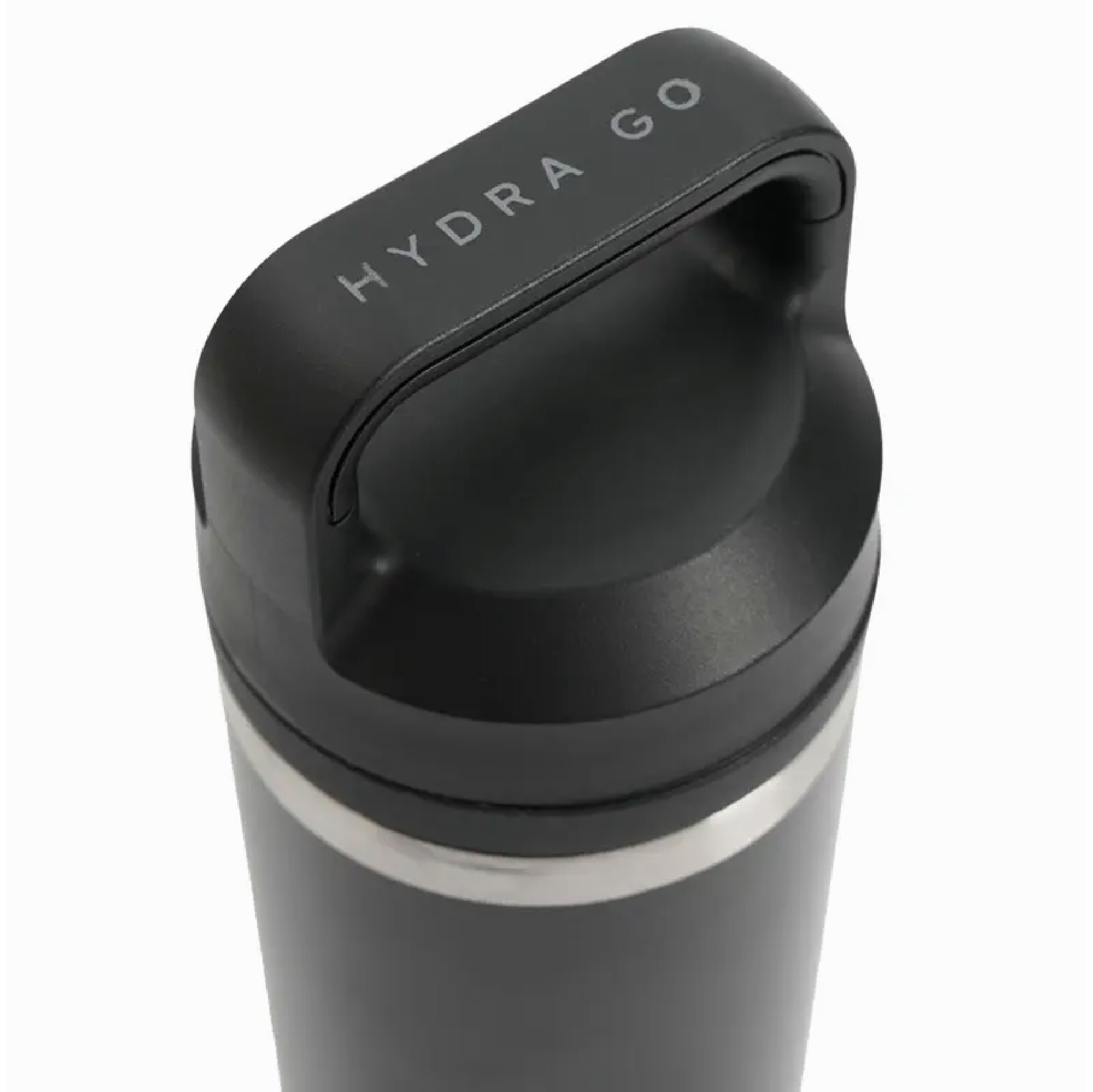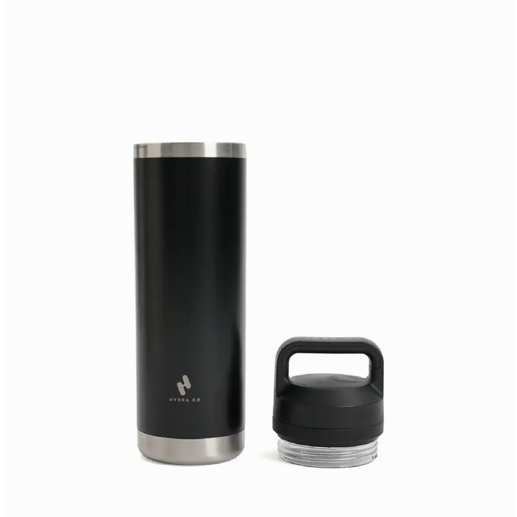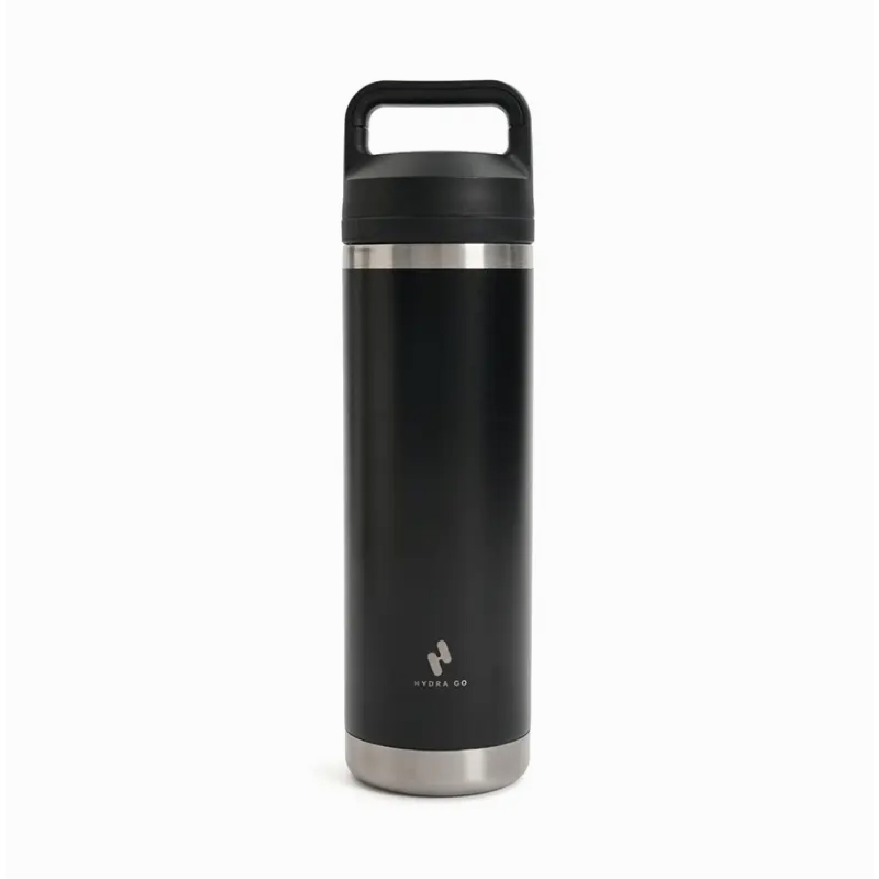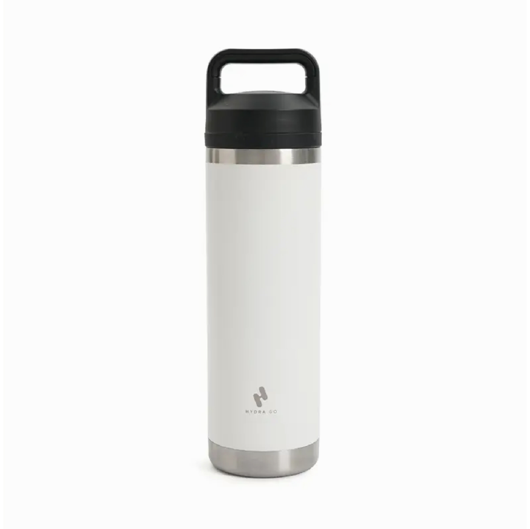 Botella térmica HydraGo con manija integrada fabricada en acero inoxidable. Hecha con cuerpo interior de acero inoxidable 304, exterior y base de acero inoxidable 201 y tapa de polipropileno, AS y silicona. Cuenta con doble pared aislante, tapa a rosca con cierre hermético y manija ergonómica incorporada para fácil transporte. Es ideal para mantener tus bebidas frías o calientes durante el día, perfecta para la oficina, actividades al aire libre o viajes. Capacidad: 600 ml / 20 oz