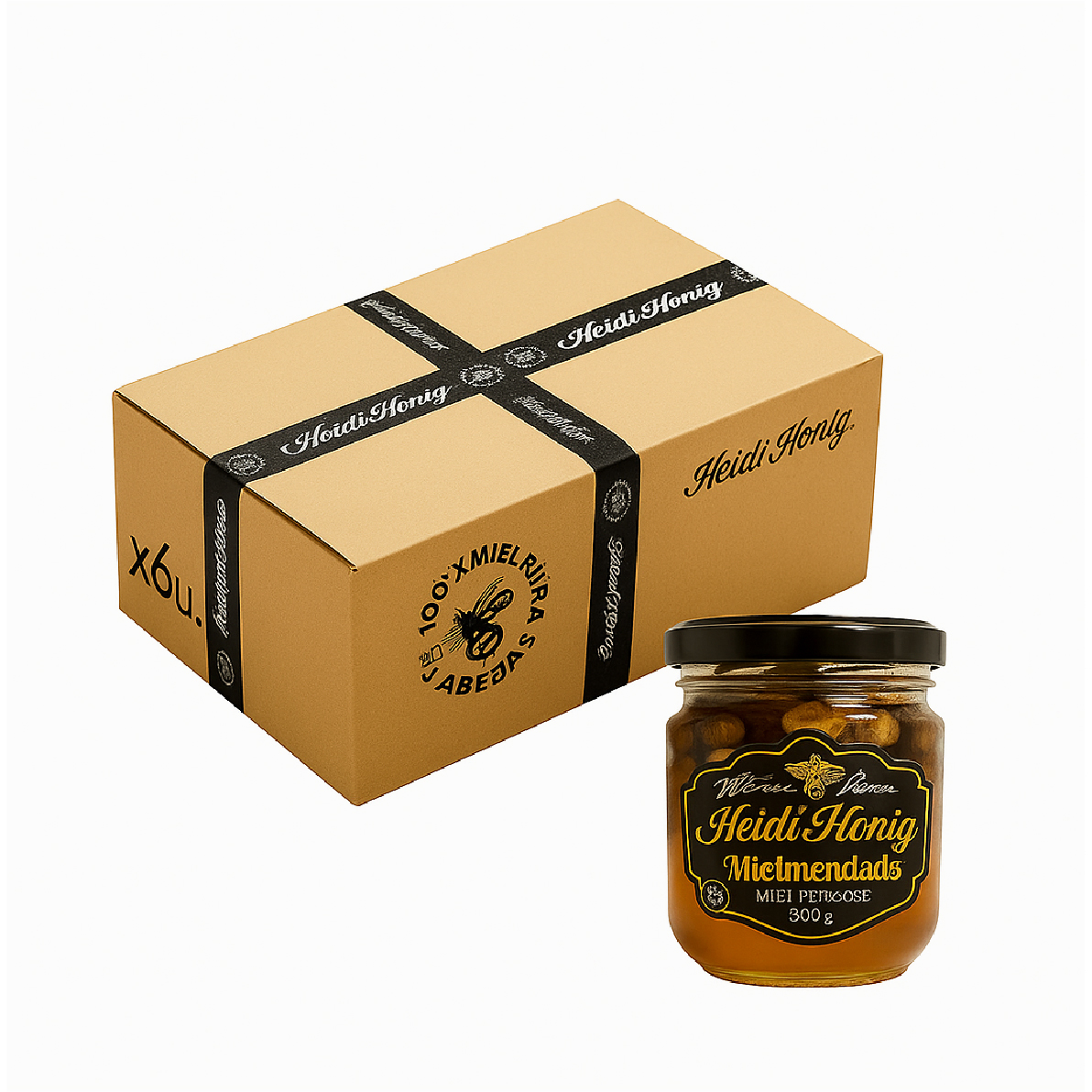 Miel virgen sin intervención ni procesos de floración de la cuenca del salado con 100 grs. de almendras tostadas non pareil. Presentación en Caja con 6 frascos de vidrio 400 g. Sin Tacc.