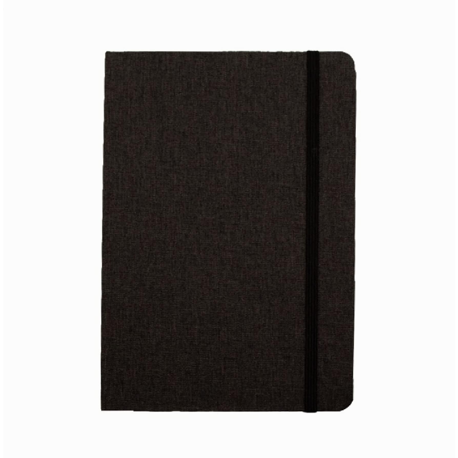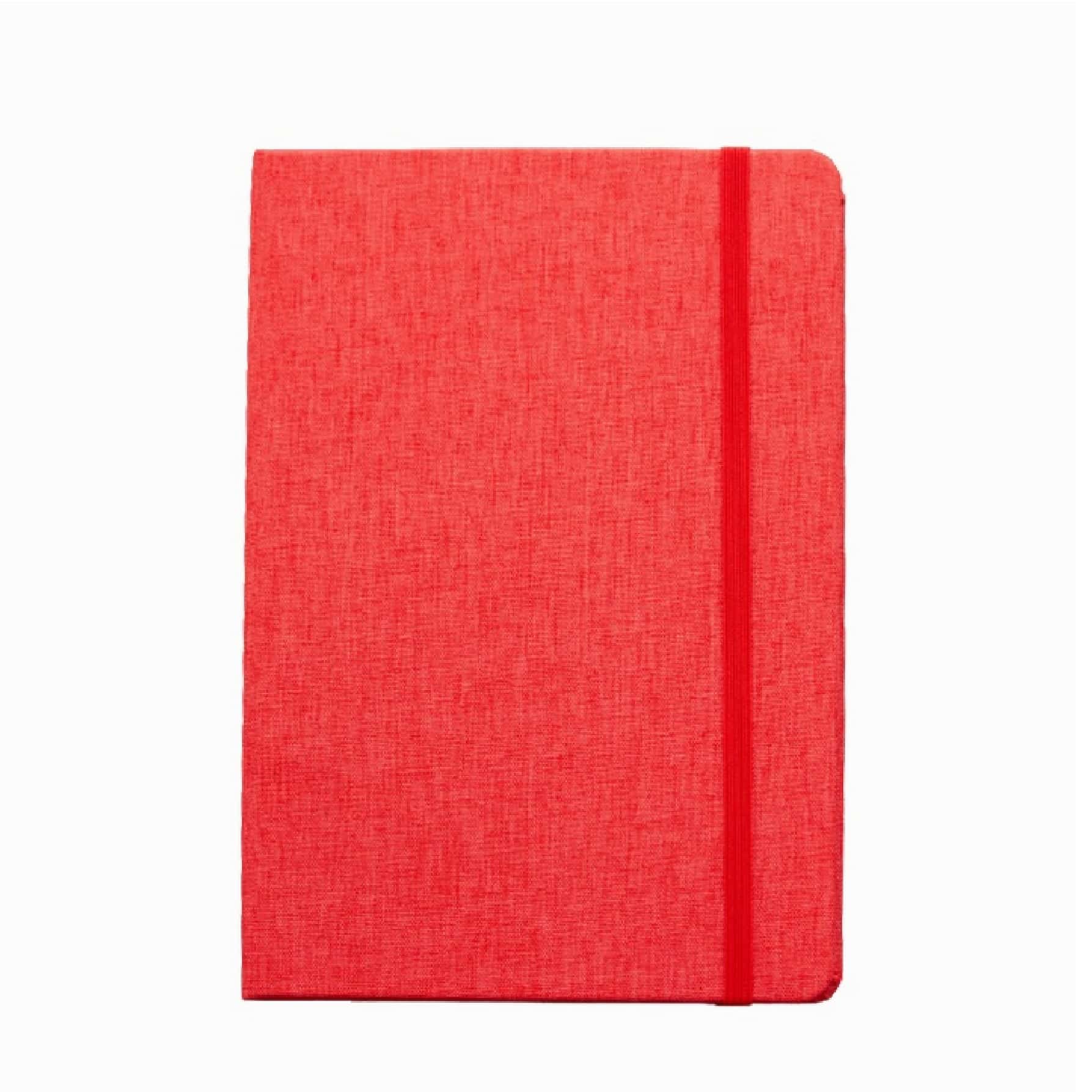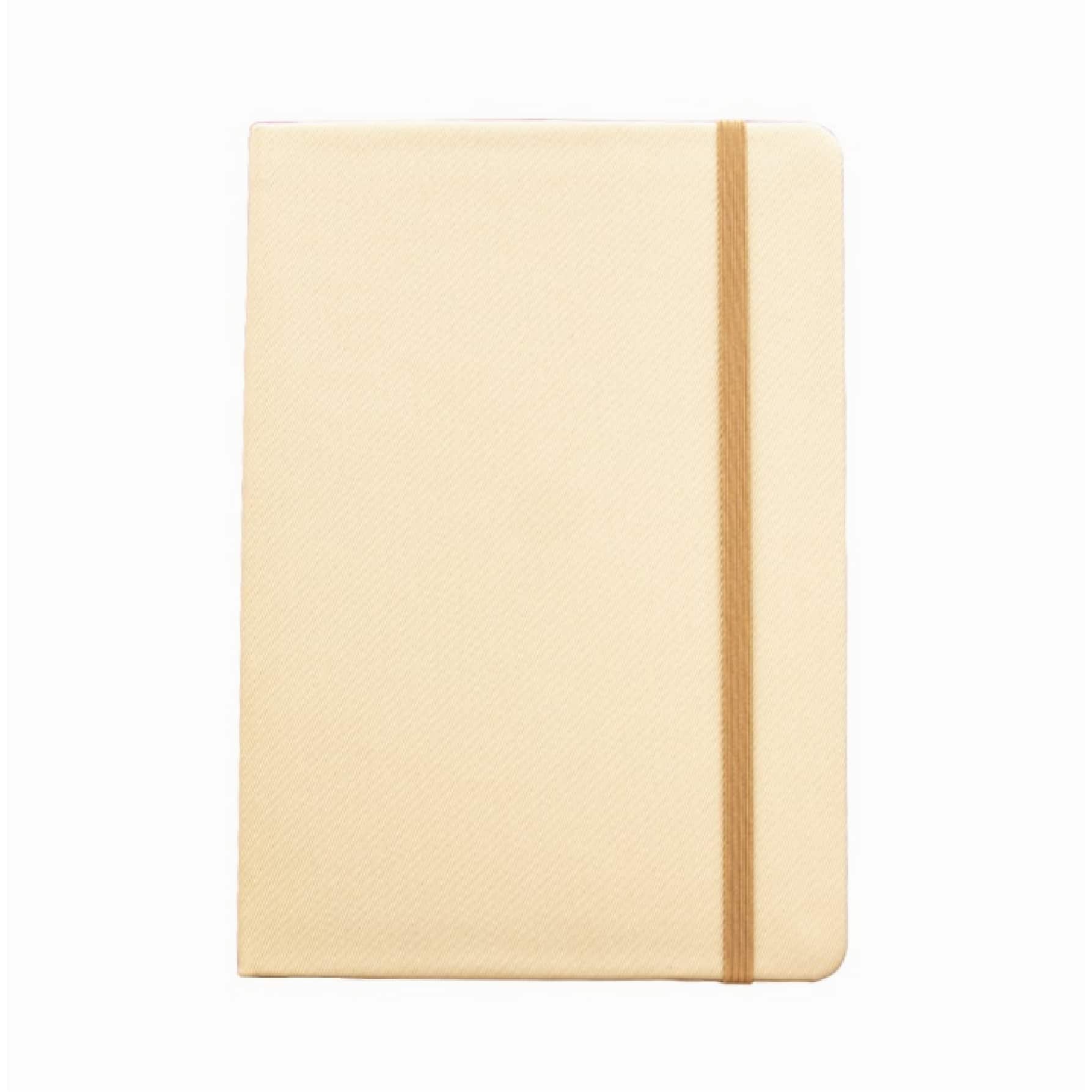 Cuaderno A5 con tapa dura fabricada en material reciclado PET (50% rPET). Incluye 96 hojas rayadas de papel de gestión forestal sustentable, marcapáginas, cierre elástico y bolsillo interior en la tapa trasera. Medidas: 14 x 21 cm. Consultar colores disponibles