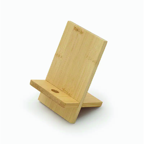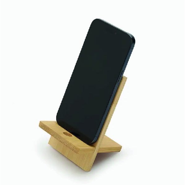 Soporte para teléfono fabricado en bambú. Práctico, liviano y fácil de transportar, es el accesorio perfecto para mantener tu dispositivo estable mientras realizas videollamadas, ves contenido o trabajas cómodamente, tanto en casa como fuera de ella. Además, incluye un orificio que permite el paso del cable facilitando la carga del dispositivo mientras está en uso.