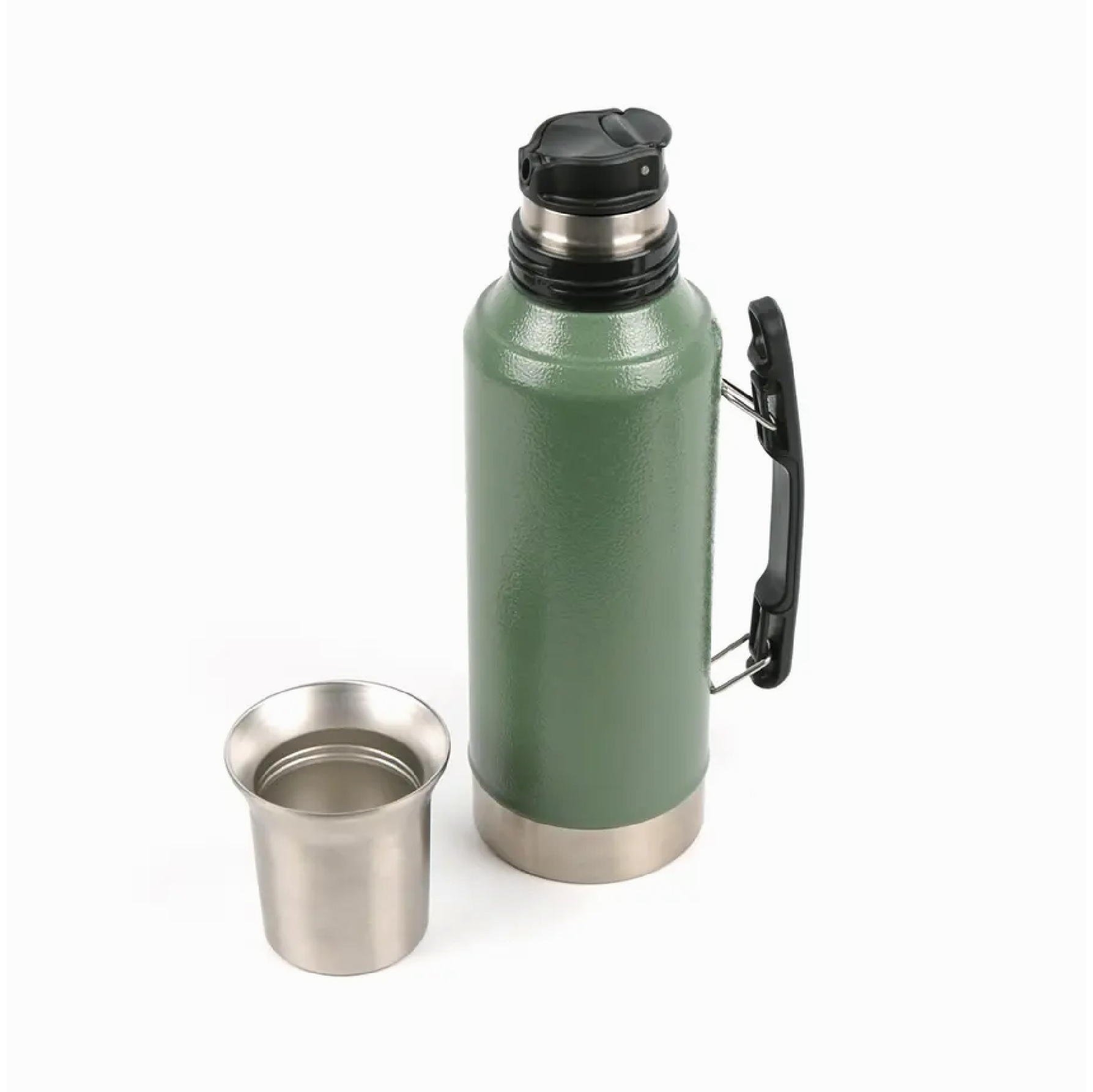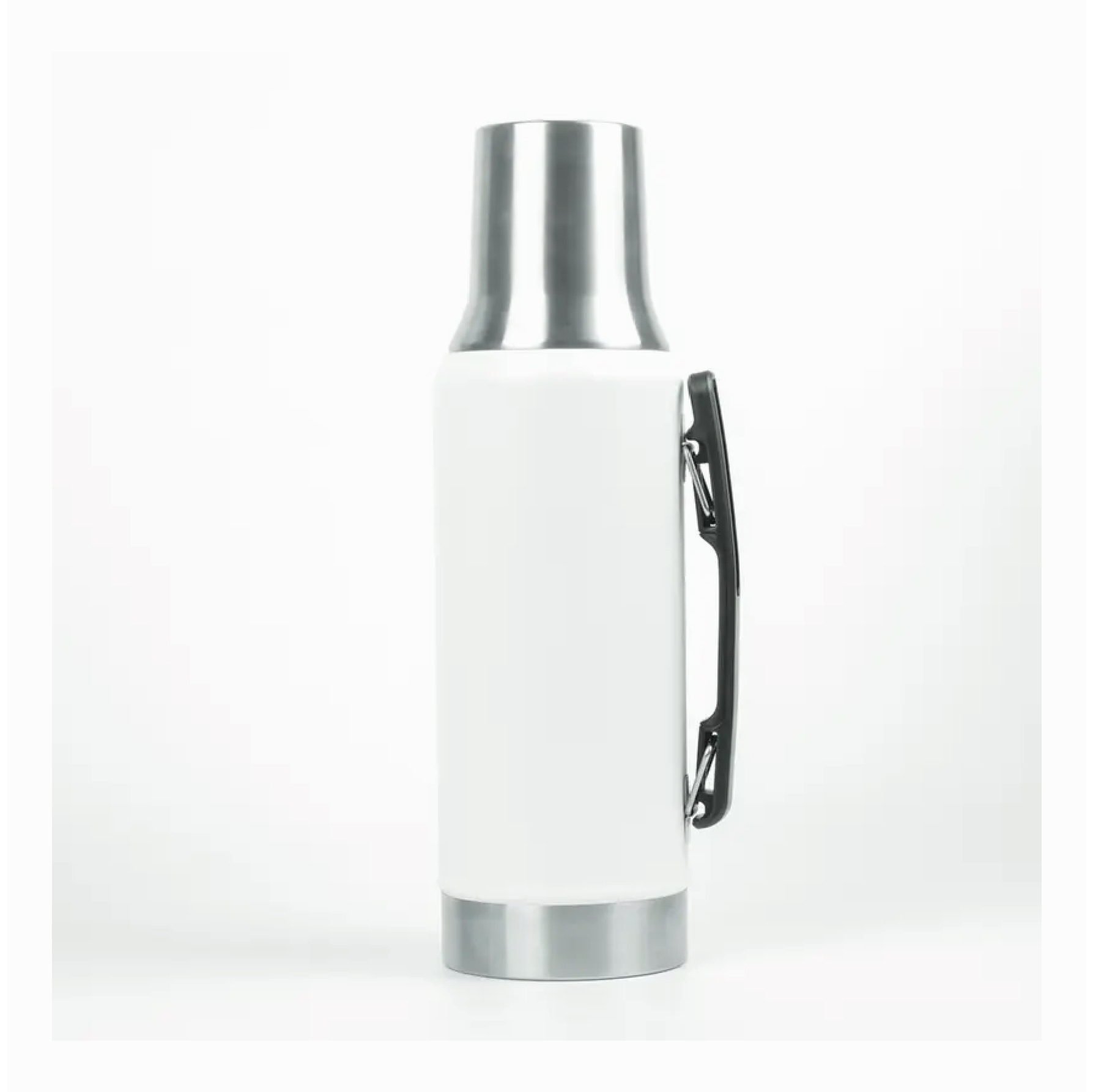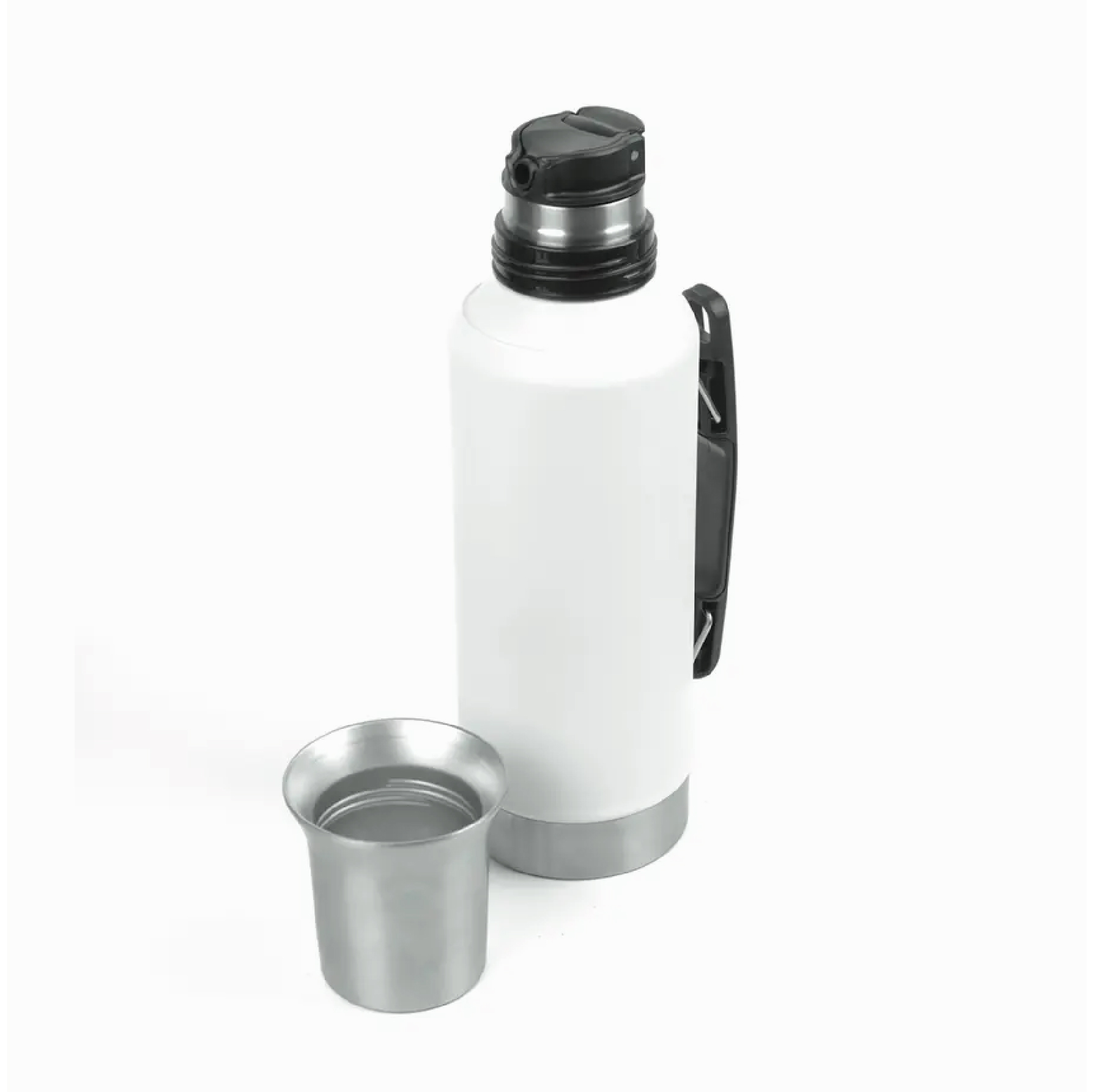 Termo de doble pared con aislamiento al vacío, interior de acero 304 y exterior de acero 201 con acabado mate en pintura powder coat resistente y duradera. Mantiene las bebidas calientes por más de 12 horas y frías hasta 24. Incluye tapón cebador de precisión y tapa a rosca que funciona también como mate o taza de 200 ml. Con capacidad de 1 litro y práctica manija para transportar, es la combinación perfecta de diseño, funcionalidad y resistencia.