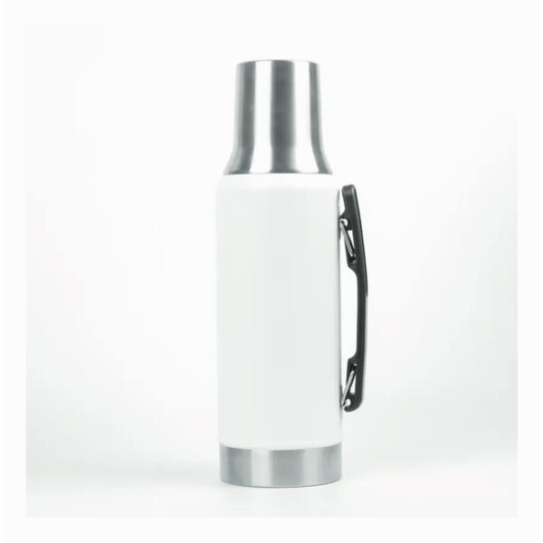Termo de acero inoxidable 304 premium con capacidad de 1 litro. Diseñado para conservar bebidas calientes por hasta 15 horas o frías por 24 horas. Cuenta con tapa multifunción que permite usarla como mate o vaso, y manija rebatible para un transporte cómodo. Certificado por el INAL y libre de BPA, apto para uso alimentario seguro. Medidas: 31,5 cm de alto y 7,5 cm de diámetro. Peso: 720 g. Presentación en caja unitaria blanca.